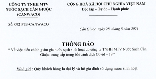 THÔNG BÁO CÔNG TY TNHH MTV NƯỚC SẠCH CẦN GIUỘC ĐIỀU CHỈNH GIẢM GIÁ NƯỚC SẠCH SINH HOẠT TRONG BỐI CẢNH DỊCH COVID-19