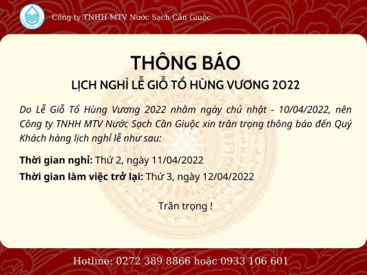 Tin tứcTHÔNG BÁO LỊCH NGHỈ LỄ GIỖ TỔ HÙNG VƯƠNG 2022 Posted on 9 Tháng Tư, 20229 Tháng Tư, 2022 by CANWACO Công ty TNHH MTV Nước Sạch Cần Giuộc xin thông báo lịch nghỉ Giỗ Tổ Hùng Vương 2022 như sau: LỄ THÀNH LẬP CÔNG ĐOÀN CƠ SỞ CÔNG TY TNHH NƯỚC SẠCH CẦN GIUỘC GIẢI BÓNG ĐÁ – CÔNG NHÂN VIÊN CHỨC LAO ĐỘNG HUYỆN CẦN GIUỘC NĂM 2022