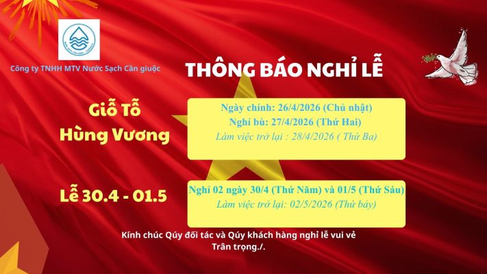 Thông báo công tyTHÔNG BÁO LỊCH NGHỈ LỄ GIỖ TỔ HÙNG VƯƠNG , GIẢI PHÒNG MIỀN NAM VÀ QUỐC TẾ LAO ĐỘNG Posted on 25 Tháng Tư, 2026 by CANWACO 25 Th4 Công ty TNHH MTV Nước Sạch Cần giuộc xin thông báo lịch nghỉ Lễ như sau: THÔNG BÁO LỊCH NGHỈ TẾT NGUYÊN ĐÁN BÍNH NGỌ NĂM 2026