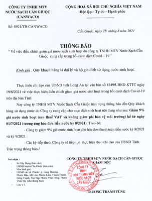 Ngày 15 tháng 1 năm 2021, Công ty TNHH MTV Nước Sạch Cần Giuộc (CANWACO)[...]